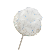 本產品由固定盤和密封盤組成,固定盤和密封盤由連接鋼套連接。固定盤是由鎳鈦合金材料構成的骨架,骨架舉有彈性。在骨架上設有固定錨,固定錨刺入左心耳壁,以固定器材在左心耳上。密封盤是由鎳鈦合金絲構成的彈性支撐鋼盤,密封盤的近端裝有連接螺絲,輸送鋼纜和連接螺絲連接,輸送鋼纜通過輸送鞘管把本產品輸送到預定部位。固定盤和密封盤都縫有阻流膜。